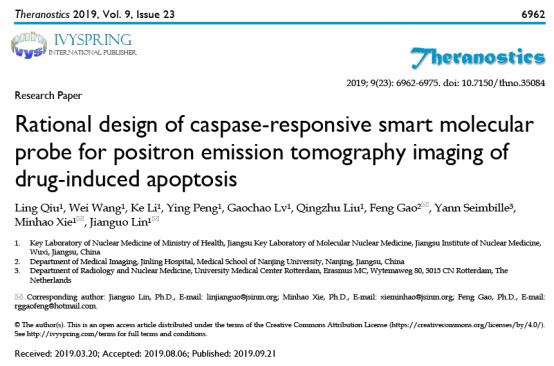 近日,我所創新藥物研究中心林建國團隊在生物醫學1區雜志《Theranostics》(影響因子8.063)上發表論文,報道了一種具有Caspase響應型的智能正電子發射斷層掃描(PET)顯像探針,可用于腫瘤的早期凋亡顯像,將為臨床腫瘤治療的早期療效評價提供新技術。