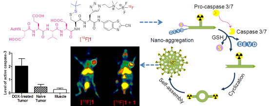 在此項研究中,研究團隊設計合成一種可激活型Caspase靶向分子探針,通過一步18F離子交換標記法,可獲得放射化學產率為53±6%、放射化學純度大于99%的標記產物,整個標記過程僅需半小時。標記簡便、快捷,產率高,穩定性好。該分子探針可被Caspase-3/7特異性剪切、分子間成環,通過自組裝大大增加了在靶點部位的滯留。Micro-PET顯像結果表明,該探針在正常腫瘤及化療誘導凋亡模型小鼠中的攝取有明顯差異。注射探針15分鐘后即可在凋亡腫瘤中觀察到清晰的圖像,靶/本比高,因而可早期、靈敏的對腫瘤療效進行有效評價,將是一種十分具有臨床應用前景的凋亡分子探針。