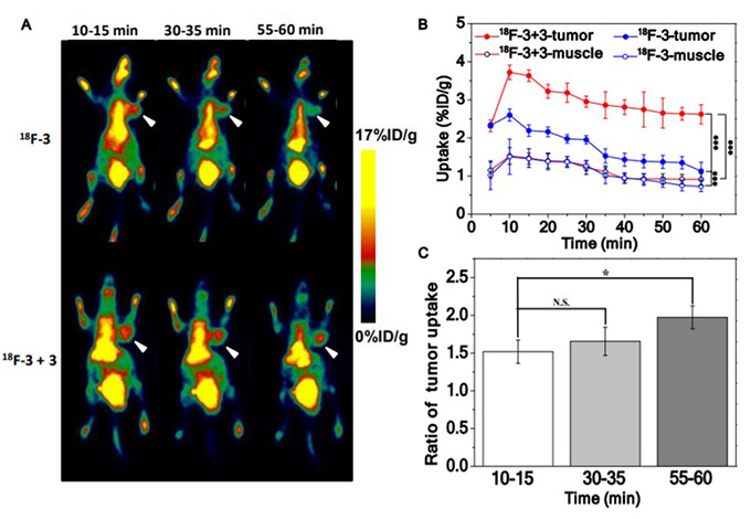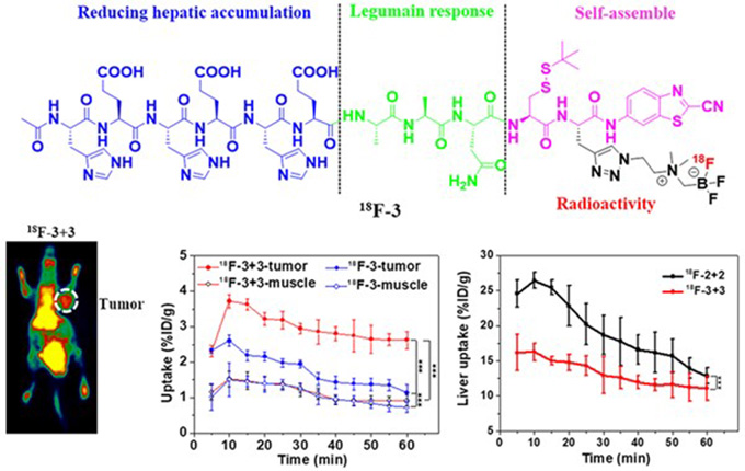 在上述實驗基礎上,研究團隊還進行了引入標記和共注射策略的優化實驗:通過在探針18F-3中引入三組組氨酸-谷氨酸親水肽鏈(HE)3標記,顯著減少肝臟蓄積,而不影響腫瘤攝取;采用共注射策略(18F-2 + 2和18F-3+ 3)使腫瘤攝取顯著增加,信噪比顯著提高。結果表明,探針18F-3對監測天冬酰胺內肽酶在腫瘤中的表達水平具有良好的特異性與靈敏度,對天冬酰胺內肽酶過表達相關的疾病在早期發現與療效監測方面具有較好的應用潛力。(創新藥物研究中心)