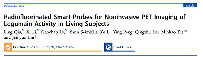 我所創新藥物研究中心一項以天冬酰胺內肽酶為靶向的放射性氟標記探針研究工作取得新進展,用自主研制出的兩種探針18F-2和18F-3對腫瘤中的天冬酰胺內肽酶活性進行正電子發射斷層掃描成像(PET),證實其所具有的良好的特異性識別能力與檢測信號增強功能。近日,這一成果發表在國際期刊一區雜志《Analytical Chemistry》2020年第92期上。