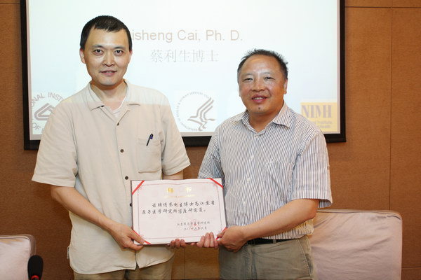 6月13日,羅世能所長向美國國立衛生研究院(NIH)、國立精神衛生研究所(NIMH)蔡利生博士頒發了聘書,聘請他為我所客座研究員。蔡博士主要從事正電子放射性藥物的研究,尤其在診斷老年癡呆癥、焦慮癥等神經退行性疾病的放藥研究方面頗有建樹。當日,蔡博士為我所科研人員作了題為“表達在血腦屏障 (BBB) 上的 P-gp 蛋白質功能 PET 成像”的學術報告,并與大家進行了熱烈討論與交流。近年來,我所堅持招才與引智并舉,大力引進外部智力為我所用,先后聘請了多名國內外知名大學、科研機構的專家為我所客座研究員,提升我所的科研創新能力。(科教科 張波 文/圖)