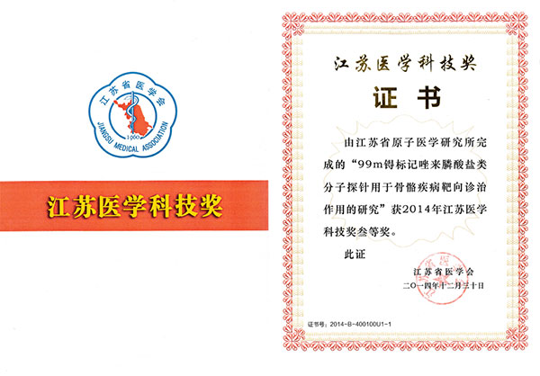我所一項目“99m锝標(biāo)記唑來磷酸鹽類分子探針用于骨骼疾病靶向診治作用的研究”獲2014年江蘇醫(yī)學(xué)科技獎三等獎。
