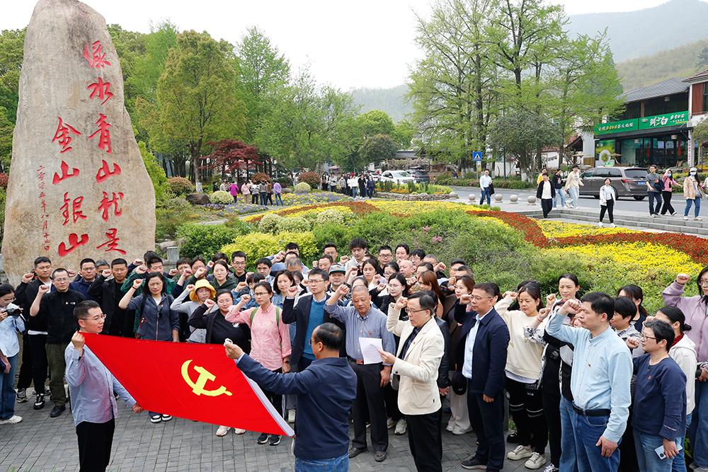 “綠水逶迤去,青山相向開”,4月13日,沿著習近平總書記的考察足跡,大家來到“綠水青山就是金山銀山”理論誕生地——安吉余村。群山環繞,秀竹連綿,令人神怡的余村綠色生態,讓大家真實感受到習近平總書記的“兩山”理論在安吉的生動實踐。在講解員的帶領下,大家詳細參觀了余村文化館,深入了解余村從“礦山”到“青山”,從“賣石頭”到“賣風景”,從“靠山吃山”到“養山富山”的發展歷程以及余村的風土人情、生態經濟發展及未來建設規劃,并在余村文化禮堂觀看了“綠水青山就是金山銀山”專題紀錄片,更加深刻理解了“兩山”理論這一科學論斷的深刻內涵。隨后,沿著環村綠道,相繼在田野觀光區、院士林、“兩山”理論紀念碑等地點進行參觀學習,大家不時停下腳步,靜心欣賞,盡情呼吸著清新的空氣,臉上洋溢著對美好生態的贊嘆,心中更加堅定了貫徹新發展理念的決心,以及敢立潮頭逐浪高、奮楫揚帆勇爭先的使命擔當。