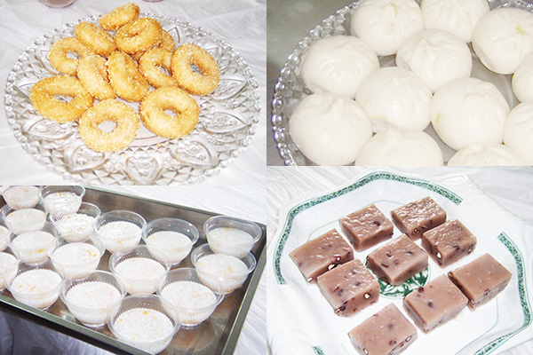 揉、搟、卷、搓,爐火閃閃,蒸氣騰騰,不一會(huì)兒工夫,一道道各式各樣、色彩繽紛的點(diǎn)心做成了。涼絲絲的西米露、糯篤篤的拉糕、韌質(zhì)質(zhì)的炸糯米團(tuán)、香噴噴的四喜蒸餃、清爽爽的青菜香菇包,色香味俱全,吃在嘴里,細(xì)膩潤滑、清涼可口,讓人的心都變得柔軟起來。