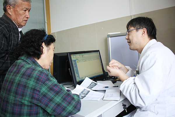 查好房后,在去往二樓外科專家門診的電梯里,朱主任才有空告訴筆者為什么要首先看看術后患者的傷口引流管,管子里體液的量和色能直觀地反映傷口內部是否發生了異常出血,及早發現、排除患者遭遇術后喉痙攣而窒息的風險。“最大的風險在術后,所以我們要管理好患者的所有狀況。”話剛落音,電梯門開,一種烏泱泱的人群升騰出的喧囂聲音讓人感受到二樓專家門診區到了,眼尖的患者說“朱主任來了”。小心穿過人群,輕開診室門,朱主任一邊身體落座一邊雙手打開第一位患者的病歷本,帶著笑意,注視著患者,還是那樣輕柔地問:“是怎么不舒服啊?”。得到回答后,朱主任仔細用手檢查了患者的脖頸上甲狀腺處,溝通了一些病情,告訴患者需要驗血和做B超看看,在電腦系統里操作好后,他看著患者說“三樓繳費,三樓檢查,做好再回來”。這是一位患者與醫生問診的全部,卻只是朱主任這一天里100多次問診的一個片段。絕大部分患者取到檢查報告單之后還需要再次商討病情、開具處方,“3個月(或6個月或1年)后來復查一下”、“少吃海帶、紫菜和海蜇頭這些含碘食物”、“空腹、一次2粒半”等等這樣的叮囑(筆者注:醫囑因人而異,上述僅作舉例)和解釋計不清重復了多少遍。
