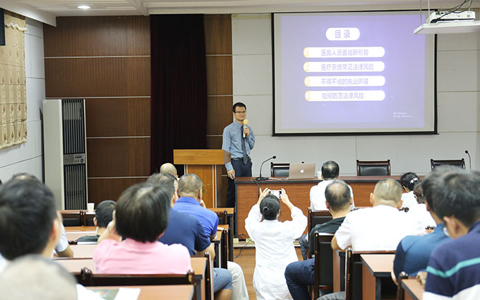 為全面貫徹落實省紀(jì)委專責(zé)監(jiān)督意見整改工作,根據(jù)省衛(wèi)計委行業(yè)黨委《關(guān)于在全省衛(wèi)生計生系統(tǒng)開展“以案促廉 堅守底線”警示教育的通知》文件精神,9月28日下午,在所階梯教室,所紀(jì)委邀請馬駿律師作題為“新形勢下醫(yī)療系統(tǒng)刑事法律風(fēng)險”的講座。大會由所長、黨委書記謝敏浩主持,全所班組長以上干部、重點崗位人員、江原醫(yī)院醫(yī)務(wù)人員近一百人參加講座,接受教育。
